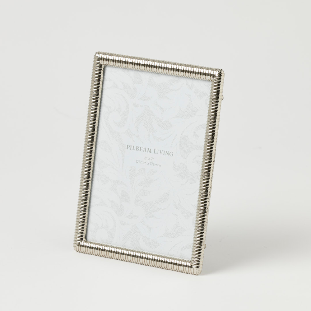 The Pilbeam Living Aerin 5 x 7โณ Photo Frame โ Silver features a finely textured border with a sleek silver finish for a timeless, refined look. A beautiful way to highlight a cherished photo on a shelf, mantle or tabletop.