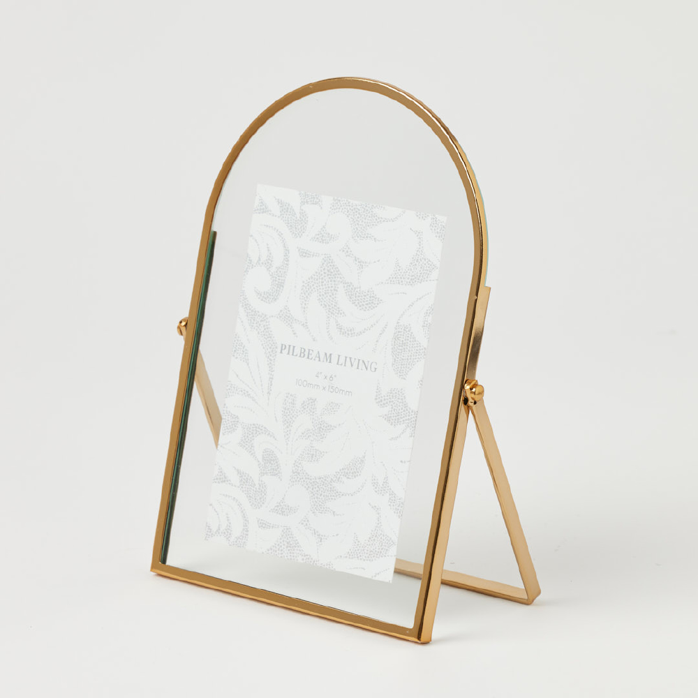 The Pilbeam Living Akira 4 x 6โณ Photo Frame โ Gold brings a modern touch to any interior with its elegant arched silhouette and metallic gold finish. Designed with clear glass panels for a floating photo effect, itโs a stylish way to display cherished memories on a shelf, mantle or tabletop.