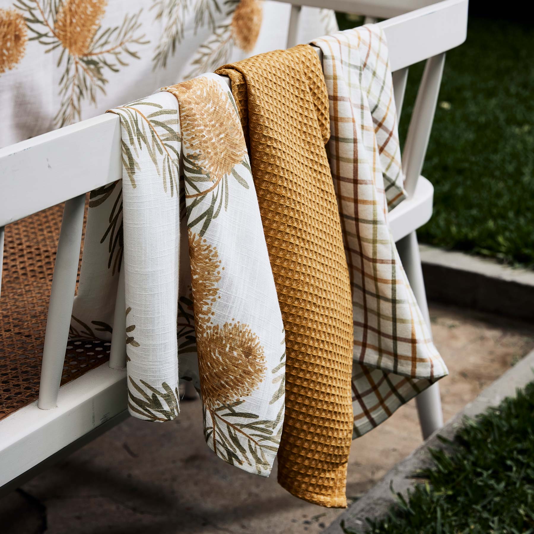 Incorporate colour, print and texture into your kitchen with the Banksia Tea Towel Pack. Featuring one banksia print, one waffle and one multi-coloured check.