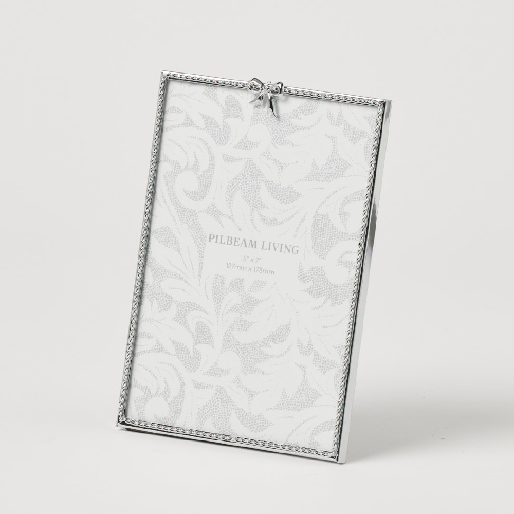 Elevate mantel and shelf displays with the Bella 5 x 7โณ Photo Frame, featuring a silver-toned edge and a delicate bow accent for a timeless, feminine finish to treasured photographs.