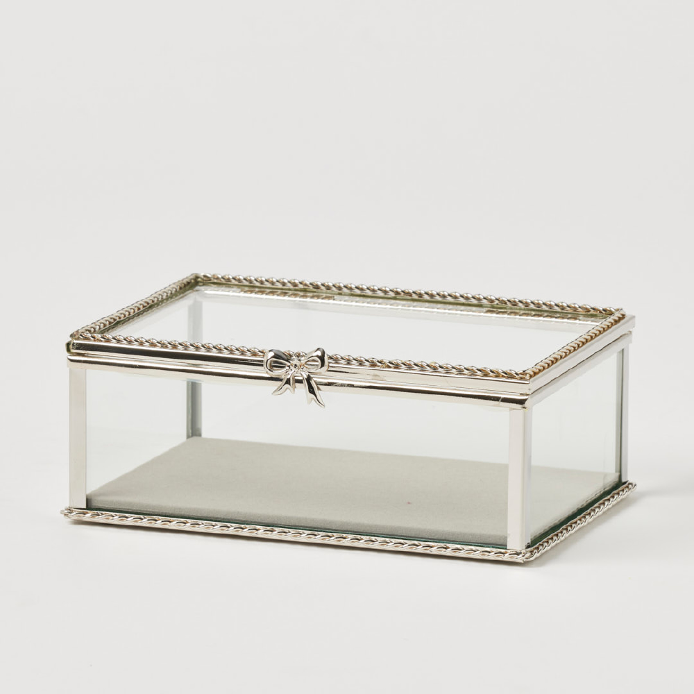 Elevate vanities and shelves with Bella Rectangular Jewellery Box, featuring clear glass panels, a polished silver-toned finish, and a delicate bow accent to beautifully display jewellery pieces.