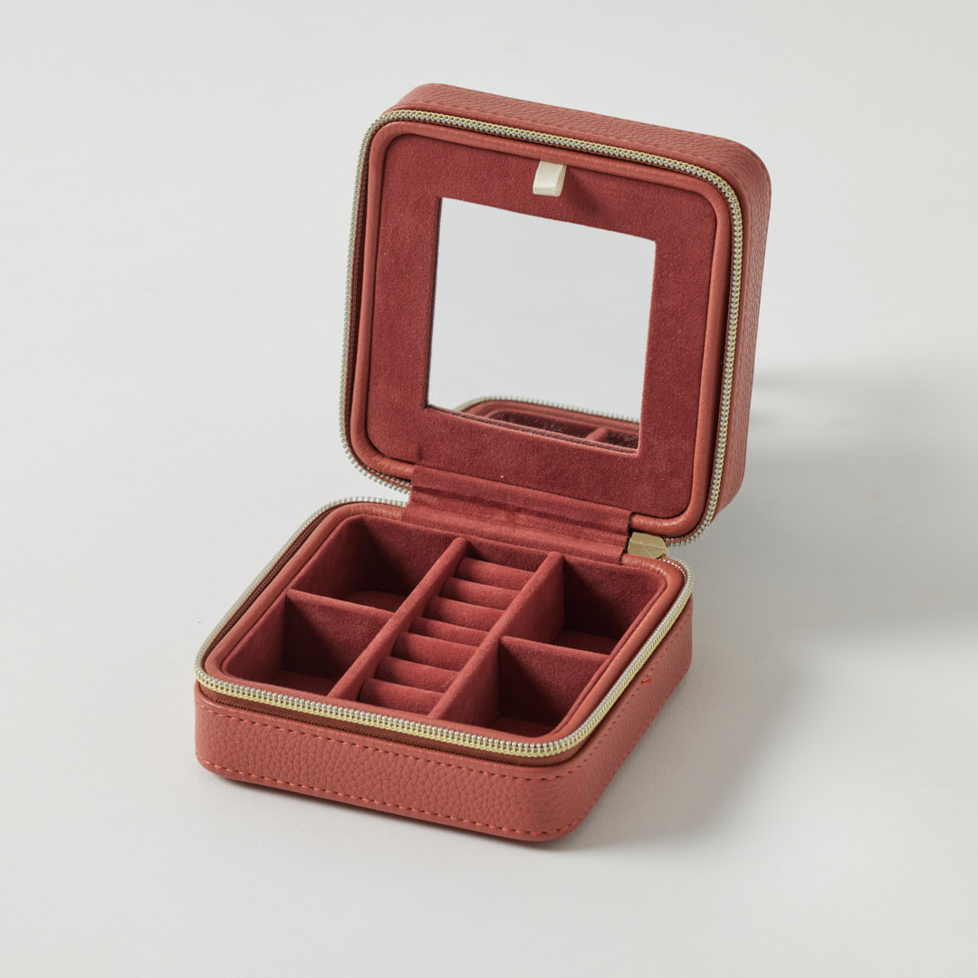 The simple and compact design of the Celine Jewellery Case makes it ideal for carrying jewellery wherever you go. Organise pieces with the built-in soft suede compartments that keep jewels secure and easy to find. Featuring a pebble faux leather textured finish and gold metal hardware for a simple, minimalist style and a small mirror to edit the finished look.