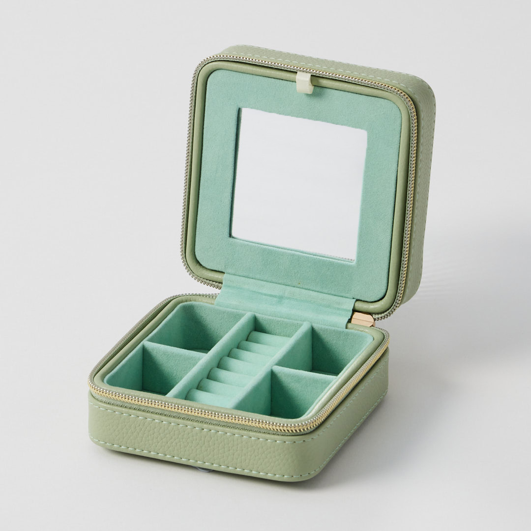The simple and compact design of the Celine Jewellery Case makes it ideal for carrying jewellery wherever you go. Organise pieces with the built-in soft suede compartments that keep jewels secure and easy to find. Featuring a pebble faux leather textured finish and gold metal hardware for a simple, minimalist style and a small mirror to edit the finished look.