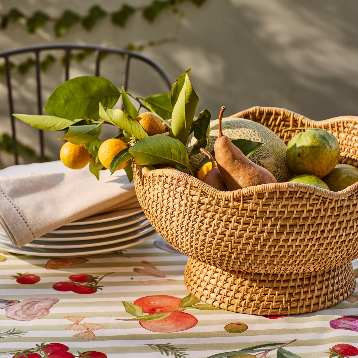 Handwoven rattan wavy pedestal bowl stained in natural honey colour.