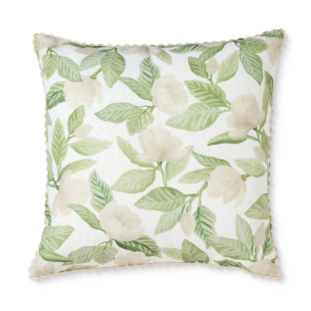 Hand painted magnolia floral print on natural background with natural reverse and ric rac trim.