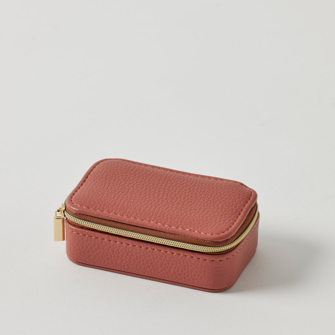 The simple and compact design of the Mila Mini Jewellery Case makes it ideal for carrying jewellery wherever you go. Organise pieces with the built-in soft suede compartments that keep jewels secure and easy to find. Featuring a pebble faux leather textured finish and gold metal hardware for a simple, minimalist style.